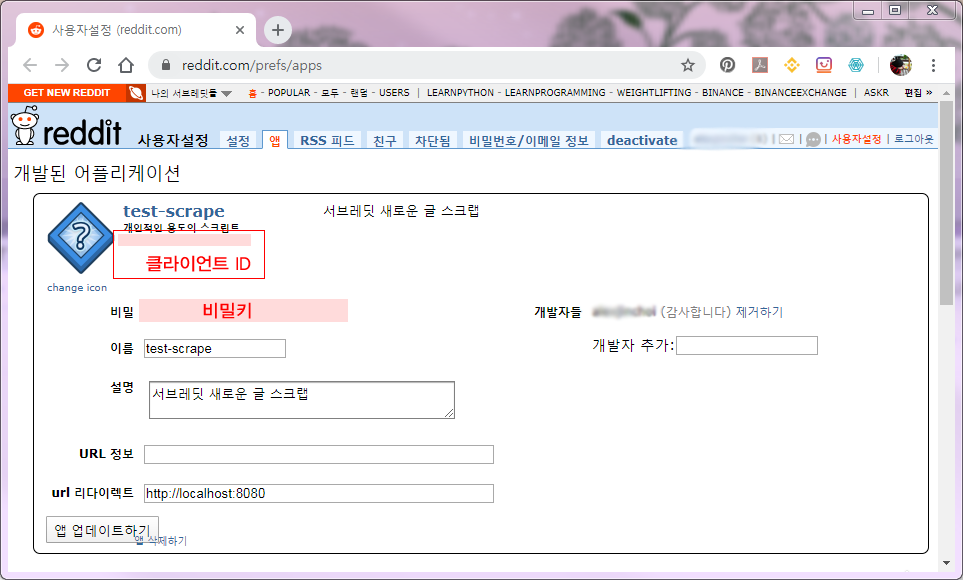 Visit Old Reddit > 사용자설정 > 앱에서 생성된 앱(https://old.reddit.com/prefs/apps/)을 확인할 수 있다.