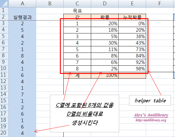 이 수식은 C3:E10 의 범위에서 볼 수 있는 헬퍼 테이블에 의존한다. C열에는 실행결과로 생성하고자 하는 8개의 수를 포함하고 있다. D열에는 퍼센트로 입력된 각각의 수에 할당된 비율을 포함하고 있다.