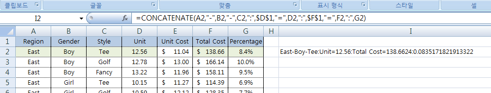 이번 포스팅에서는 통화, 백분율, 소수점 등의 수와 관련된 포맷을 그대로 유지하면서 CONCATENATE 함수를 사용하는 방법을 알아봅니다. 아래의 예를 통해 살펴보겠습니다. 아무런 가공을 하지 않으니 가독성이 현저히 떨어집니다.
