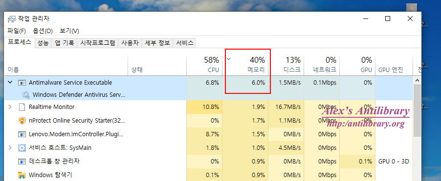 윈도우즈10 Antimalware Service Executable 메모리 점유 과다 문제