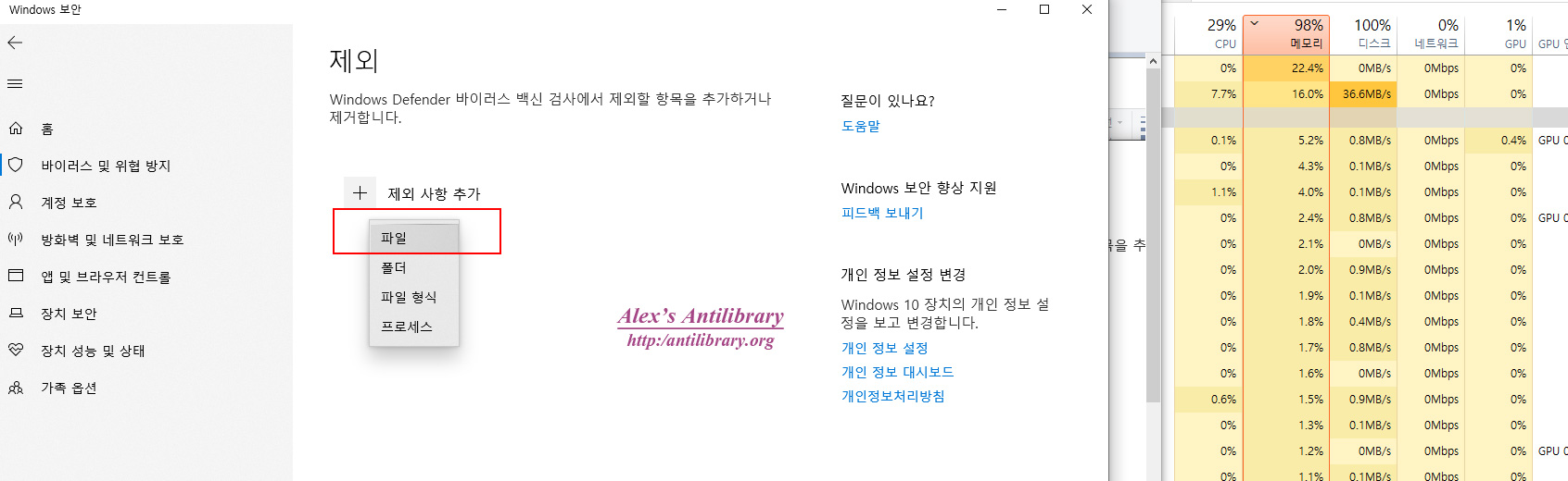 Antimalware Service Executable 프로세스가 메모리를 과다하게 점유하여 정상적인 앱실행이 어려운 경우 해결 방법입니다.