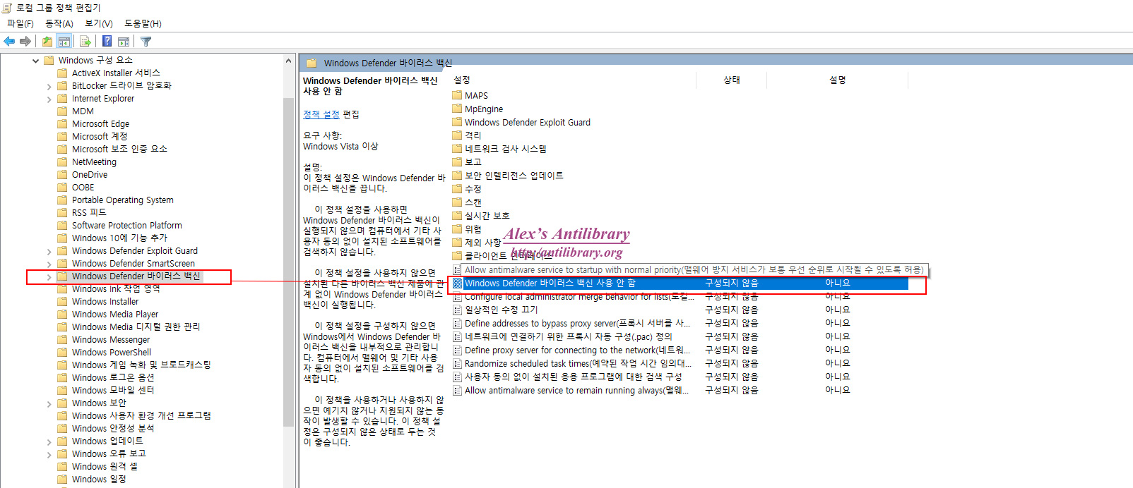 ▶Windows 구성요소 > Windows Defender 바이러스 백신 > Windows Defender 바이러스 백신 사용 안함 더블 클릭
