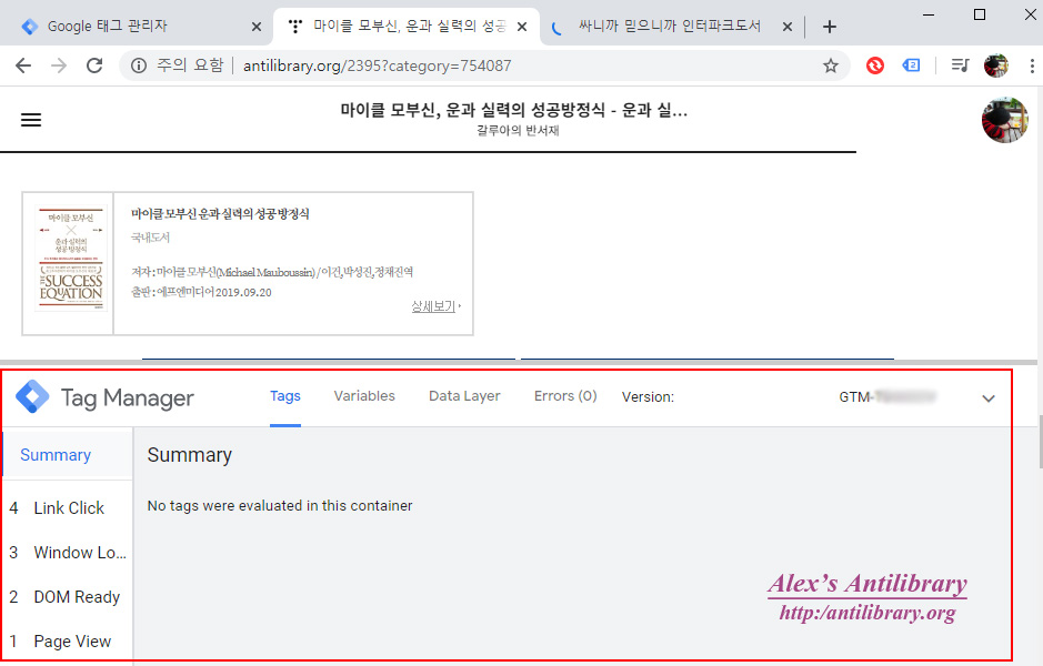 미리보기와 디버그 모드를 활성화하면 다음과 같이 미리보기 중임을 알리는 배너가 뜨게 된다. 그리고 구글 태그 매니저 컨테이너 코드가 구현된 해당 웹사이트를 새로고침하면 디버그 패널을 확인할 수 있다.