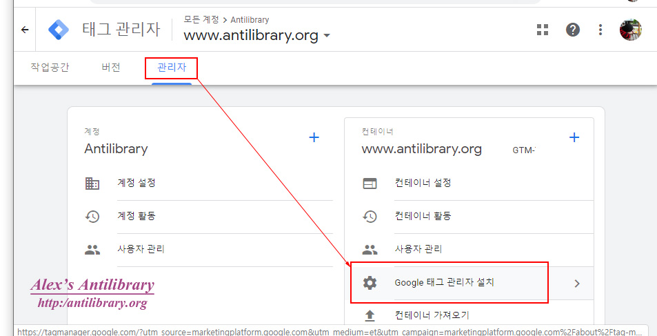 아니면 관리자 > 컨테이너 > Google 태그 관리자 설치 로 이동하여 확인할 수 있다.