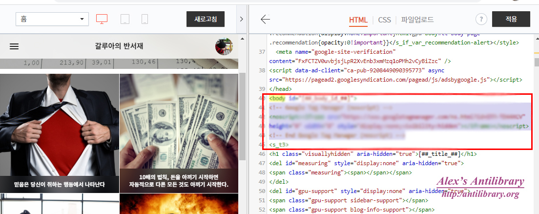 다음으로 하단의 태그는 <body> 태그 바로 뒤에 코드를 붙여넣는다..