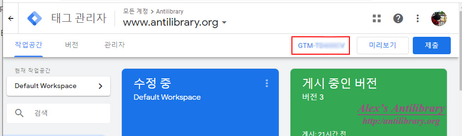 구글 태그 매니저에서 웹사이트에 붙여넣을 코드를 다음과 같이 찾을 수 있다. 미리보기와 제출 버튼 좌측의 컨테이너 ID 를 클릭하면 Google 태그 관리자 설치 팝업이 로딩된다.