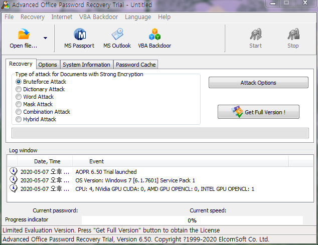 The maximal password length is limited to 4 symbols for Brute-force, Mask and Dictionary attacks Some Dictionary attack options are disabled Passwords longer than 3 symbols cannot be recovered, except password that requires Brute-force, Dictionary or Mask