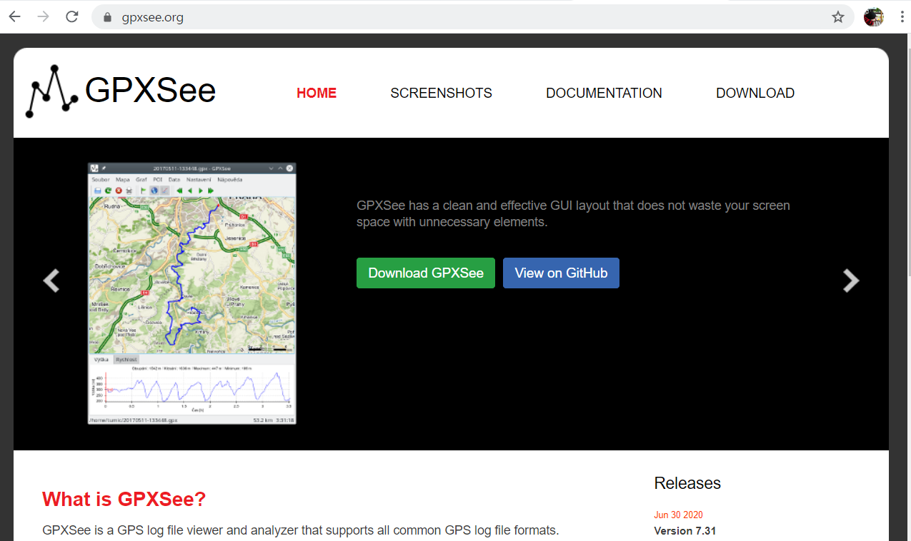 그럼 fit 확장자를 가진 위 데이터를 어떻게 볼 수 있는지 알아보자. 이를 지원해주는 여러 사이트가 있는데, GPXSee도 그 중 하나이다. GPXSee 는 대부분의 GPS 로그 파일 포맷을 지원하는 GPS 로그 파일 뷰어이다. 당연히 가민의 fit 파일도 지원한다. 해당 사이트로 이동하여 프로그램을 다운로드한 후 설치하자.