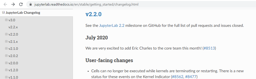 현재 JupyterLab 버전은 다음과 같다. 3.0.0 이다. 에러메시지에서 보듯이 3.0.0 미만이어야 한다. ChangeLog 는 여기서 확인한 후 이전 버전의 주피터랩을 설치하자.