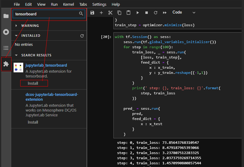 주피터랩을 실행한 후 좌측 Extension Manager 를 선택한 후 검색창에 tensorboard 라고 검색한다. 검색 결과 중 jupyterlab_tensorboard 항목을 설치한 후 Install 을 클릭한다.