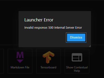 하지만 다음과 같이 Launcher Error Invalid response : 500 Internal Server Error 가 발생했다.
