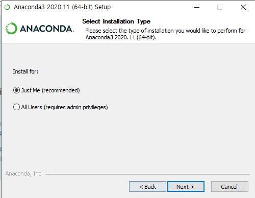 다음과 같이 설치할 사용자를 물어보는 창이 나오면, “Just Me” 를 설치하도록 한다. All Users 를 선택하는 경우 관리자 권한으로 실행을 매번 선택해야하는 경우가 생긴다.